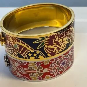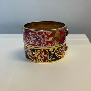 Elegant enamel cuffs with intricate floral patterns. Features vibrant red, purple, and gold tones.