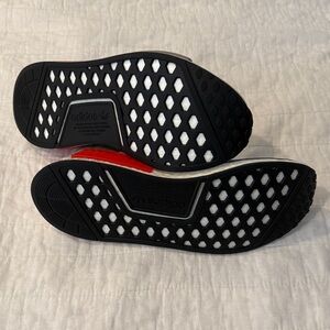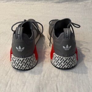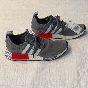 Adidas NMD R1 sneakers featuring a sleek gray design with bold red highlights. Ideal for everyday style. New with tags never been worn.