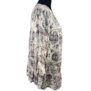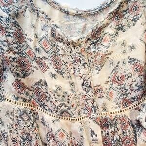 Lucky Brand Crochet BOHO top. Size M, raw hem neckline, fabric covered button closure down the back or over the head to wear. Crochet inserts, 3/4 sleeves. One owner, loved well and treated delicately.