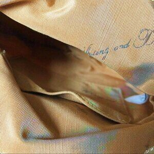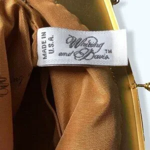 Whiting & Davis gold tone armor mesh small evening bag from the 70s. Metal top with scrolls swirl and rhinestones. Kiss snap closure. Cross body chain with 19” drop. Satin liner with brand name. Small slip posher inside. Amazing condition. Size 6.5”x6.5”