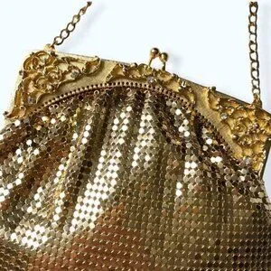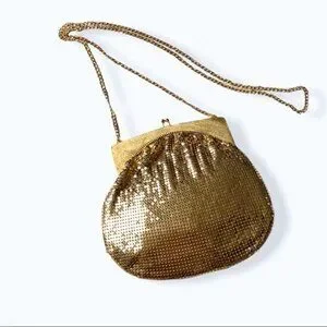 Whiting & Davis Bag 70s Gold Mesh Kiss Snap Evening Bag Crossbody Strap Purse