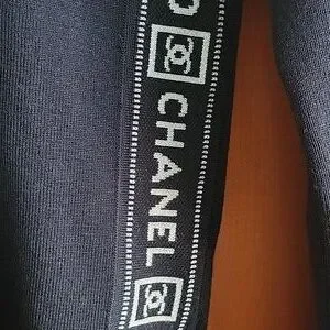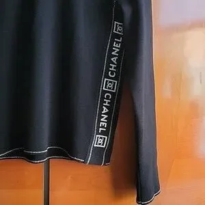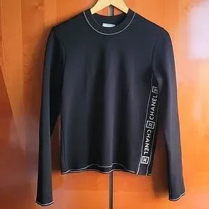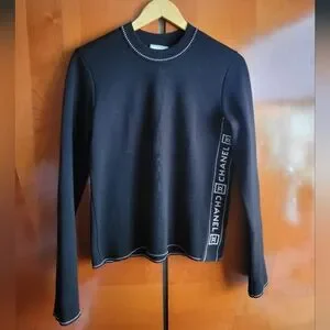 Chanel black long sleeve meduim weight swether Features white decorative tonal stitching with side large company brand name as well as interlocking CC logo in excellent gently used condition 44french fits Meduim to Large 100%wool super soft has stretch ability laying flat unstreched sholder wide 16 inch chest 18 1/4 full lenght top to bottom almost 24 inch