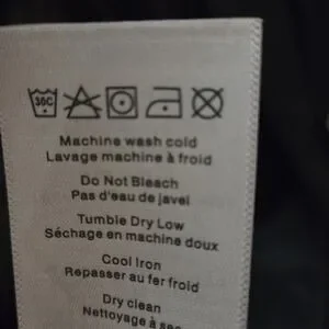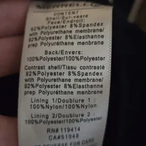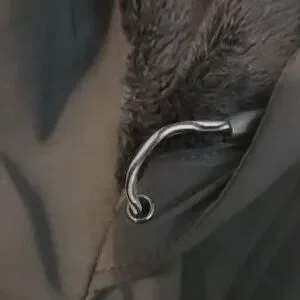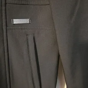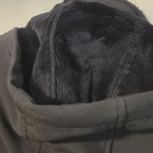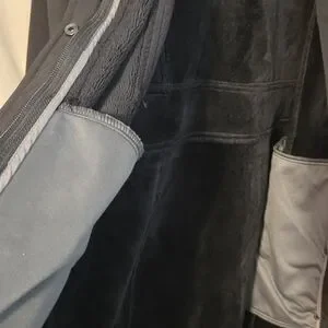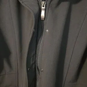 This long black coat has a soft shell, thick fleece lining including the collar and attached adjustable hood. Coat zips up and snaps as well. The 25 inch sleeves have 4 accent buttons at cuffs. There are 2 large zippered pockets.