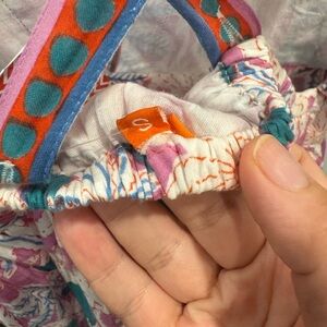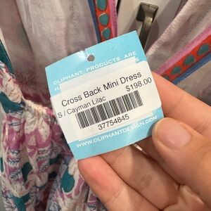 Stylish mini dress with cross back design. Features vibrant pink and teal patterns.