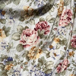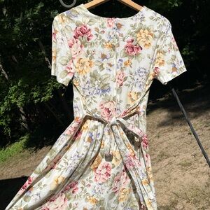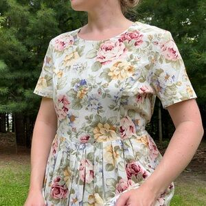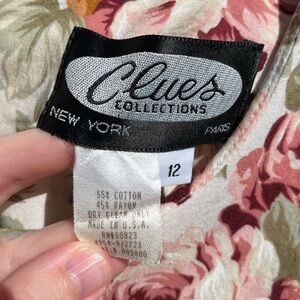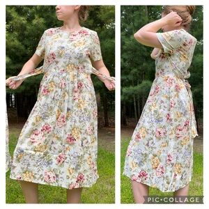 Vintage 80s or 90s floral babydoll midi dress by Clues Collections New York Paris. Love this! Cream ground w/pink, yellow, blue & sage green floral print. 55% cotton & 45% rayon. Made in USA. Tagged Women’s size 12 fits like a S/M. Modeled on a S/M 34B 29” waist 5’5” & this fits me, but it’s a little too tight across my broad shoulders/in bodice. I can get it zipped okay, but I need more room to move comfortably in the shoulders/arms. Midi length on me. Unisex. Attached tie belt to cinch waist, pleated skirt, back zipper closure. No pockets. Unlined, material is lightweight & great for Summer. In good used condition w/no noticeable flaws. Wash cold + hang dry.