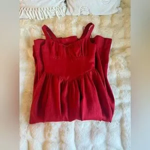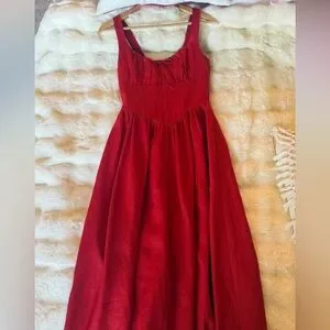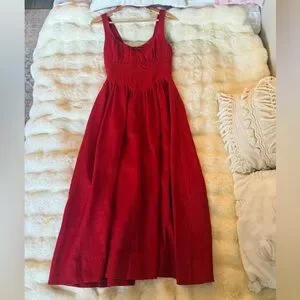 Elegant red midi dress. Sleeveless design. Flattering fit. Perfect for any occasion.