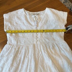 Short, white swing dress with v-neck and tie at neck. Lace/floral eyelet design. Size M.