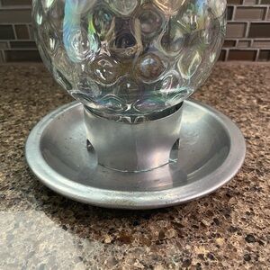 Vintage silver and iridescent globe bird feeder. Made with very durable heavy metal small bit of wear on birdseed tray (see pics). Nice sturdy hook for hanging.