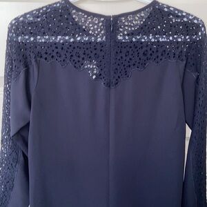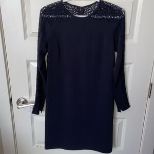 This elegant navy dress features delicate lace sleeves, perfect for any occasion. Its classic design offers a sophisticated look. Super cute zipper details on sleeve. Like new, no flaws. Will take measurements if asked. Stock photos show black version of dress, dress is navy.