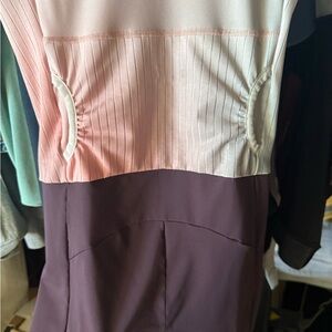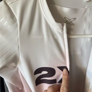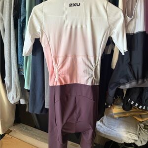 Stylish 2XU triathlon suit with a white and pink gradient design. Features short sleeves and a sleek fit. Worn for a half Ironman. Lots of breathing room in stomach. Worn 3 times total, never put in dryer. Size Small