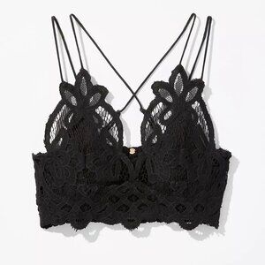 Romantic, crochet lace shapes darted, triangle cups, and a sheer bottom band while double, adjustable skinny straps cross over a smocked, elasticized back. Pull on design.