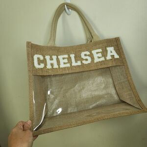 Adorable Jute Tote Bag with a Clear Front , Reads " Chelsea " in Chenille Varsity Letters