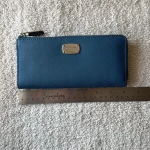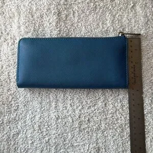 This beautiful blue wallet features silver hardware on the exterior. Inside it has 8 card slots, 2 long slip pockets, and a center zip pocket.