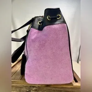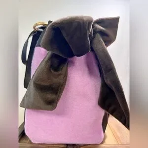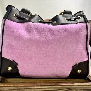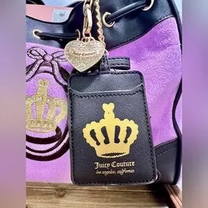 Iconic Juicy Couture Daydreamer tote in the color violet tulle. Interior of bag is fully lined with Juicy logo material and has one large compartment with a small zippered pocket on one side and slip pockets on the other. Bag has gold hardware and a small magnetic flap closure. Bag also includes two bag charms…rhinestone heart & brown card holder. Too good to pass up!!