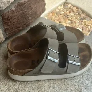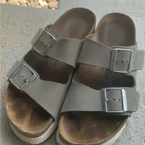 Stylish size 39 platform Birkenstock Papillio sandals with olive double straps. Features sleek silver buckles. Comes from a clean, smoke free home