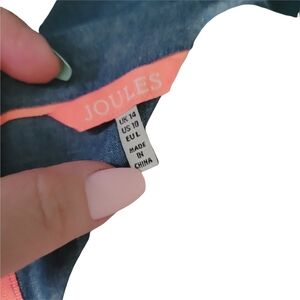 Joules "Imelda" shift dress has a stretch front that boasts white and dark navy stripes with bright floral pops AND hidden side pockets! Rounded neck.