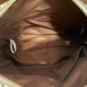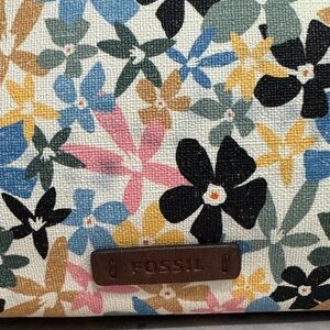 Chic and stylish Fossil handbag featuring a vibrant floral pattern. Perfect for adding a pop of color to any outfit. Beautiful supple brown leather handles & classic key fob, great used condition. Inside is pristine, it is missing the shoulder strap. One very faint smudge on the outside from carrying, see pics. Otherwise near perfect condition.