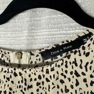 Chic Doe & Rae blouse with bold animal print. Features a stylish black and cream design.