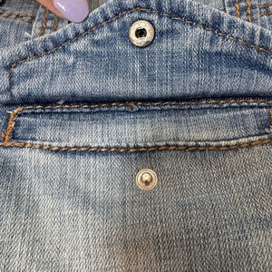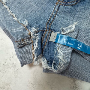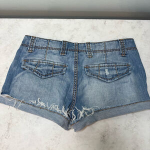 Y2K ultra low rise Mudd denim short shorts, size 5. The material is 99% cotton and 1% spandex. They feature a button closure, belt loops, and front and back pockets. The shorts have a distressed look with frayed hems on the front and back. Smoke free home.