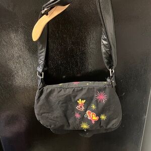 Charming Disney crossbody bag. Features vibrant graphics on a black background. Ideal for Disney fans.