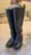 Stylish black leather knee-high boots with a cozy cream lining. Perfect for a chic and comfortable look.