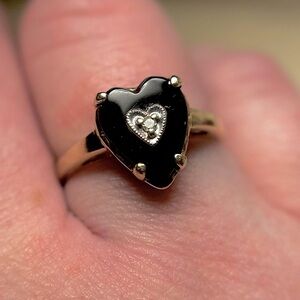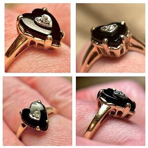 1980s estate Sz7.25 10kt solid YG/WG HEART ONYX & .01ct DIAMOND heart ring EUC