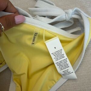 Stylish yellow bikini bottom with white trim. Perfect for the beach.