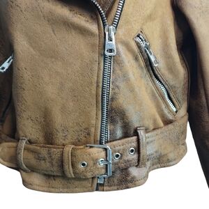 Bershka Women's Size Medium Brown Faux Suede /Leather Cropped Jacket ZIP Up Belt