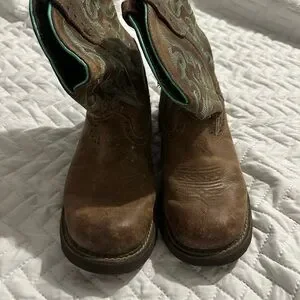 Justin Gypsy Gemma Brown Ladies Western Boot in distressed chocolate brown leather features a lively sea green stitch pattern and matching collar seam for a colorful edge. The Gemma is a modern twist on a classic style making it a great all around every day boot, featuring J-flex comfrot system insole with removeable orthotic that offers all day wearing comfort. Gypsy style pairs perfectly with jeans or skirts, ideal for everyday wear, or heading to the barn.