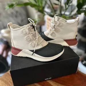Stylish Sorel waterproof boots. Black and cream upper with brown accents. Durable and comfortable for adventures.
