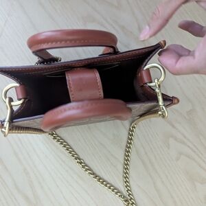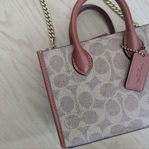 Stylish Coach crossbody bag with signature pattern. Features beige and pink tones. Gold chain strap for added elegance.