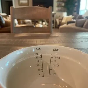 The Longaberger Pottery Woven Traditions Pink Measuring Cup Batter Bowl is a charming and practical addition to any kitchen. Made in the United States, this 3 cup 24 oz toleware bowl is perfect for measuring out ingredients while cooking or baking.