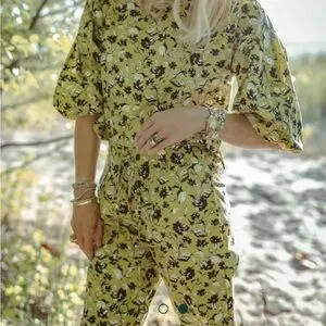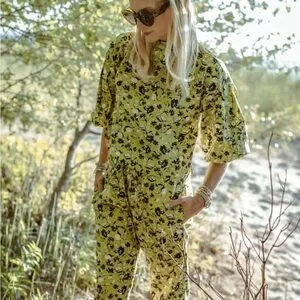 From the brand: “Since introducing our Le Culottes in 2023 we’ve fallen in love with the fit and versatility of the silhouette. In fact, we are so in love, we decided to introduce them as a full-length pant! So… while they aren’t technically a culotte, we kept the name intact to make sure it was obvious that the fit was the same with just added length. The same elastic back waist, flat front, and pockets that you love, just now in a full-length style. And this chartreuse is perfect for fall dressing. This textile has intentional variations of color in the black and grey floral print to mimic that of a hand-painted block print.”