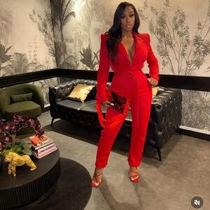 Bold red pantsuit with structured shoulders. Perfect for making a statement.