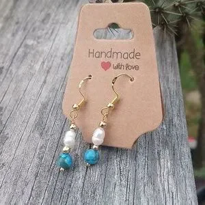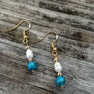 Beautiful Turquoise & freshwater Pearl Dangle Earrings in 14kt gold plated hooks and pins they measure 1" Handcrafted with quality materials from a smoke-free environment
