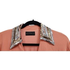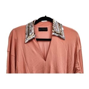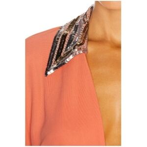 Self & Lining: 100% viscose. Made in Italy. Dry clean only. Fully lined. Hook and bar front closurePaillette sequin embellished detail along collar. Twisted fabric detail at waistHidden side zip closure. Front slit detail.