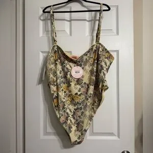 “Blonde” print. One piece suit and matching skirt. Never worn; tried on over bike shorts.