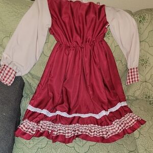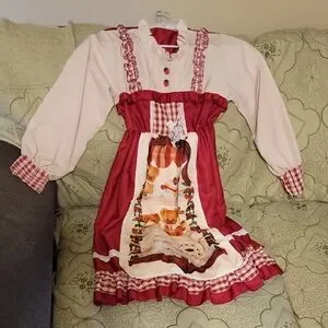 Sweet Lolita dress, a sub-style within the broader Lolita fashion, characterized by its emphasis on cuteness and childlike themes. The dress features a red and off-white color scheme, with details like ruffles, lace, and a printed panel on the skirt, which are common elements in Sweet Lolita and Kawaii fashion.
