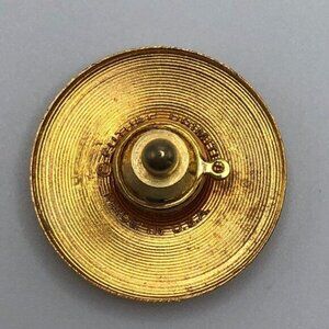 Vintage cymbal shaped tie tack pin in gold tone metal. Cymbal articulates on the pin head and even makes a small "ding" when tapped. Super fun piece. Signed Future Primitive. Made in USA. 1 1/16 inch in diameter, 6 grams.
