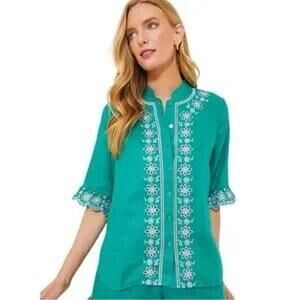 Tuckernuck Hyacinth House Green Embroidered Linen Montauk Lounge Shirt NWT Size Small