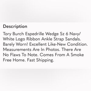 Elegant Tory Burch wedges with black straps. Tan espadrille heel for a stylish look. Perfect for casual outings.