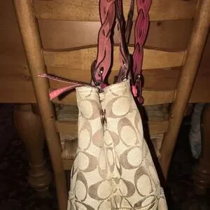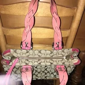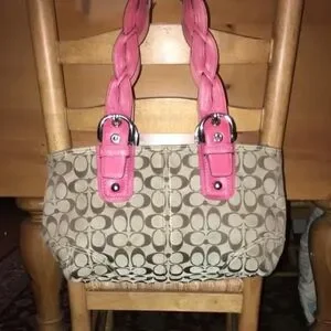 Chic Coach shoulder bag with signature pattern. Features pink braided leather handles. Stylish and functional. The outside is stain and defect free. The inside has blue ink stain that does not effect use.