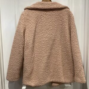 Stay cozy and stylish with this pink sherpa blazer coat. Perfect for layering, this coat offers warmth and elegance for any occasion. Very unique and cozy jacket. It is a Sherpa-like fabric with a nice lining. It’s warm, but actually feels quite light weight when wearing. Two side pockets. Double breasted. Long sleeves. It’s a dusty pink. It’s like wearing a teddy bear. I used to wear it with pink combat boots and received a lot of compliments. The only reason I’m selling is because I overbought new stuff and something has to go.