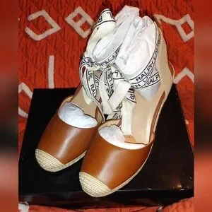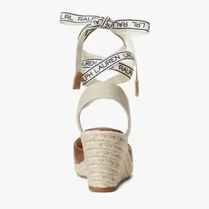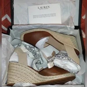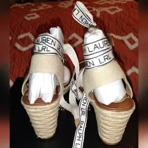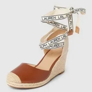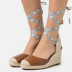 Ralph Lauren brown leather espadrille wedges. Cream fabric ankle ties featuring Ralph Lauren logo.