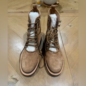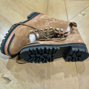The Women's Izzie Ankle Boot elevates outdoor style with its thick treaded soles and distinctive double lace detail, perfect for hiking adventures. Constructed with a leather upper and lined with cozy shearling, this boot ensures both durability and comfort. The rubber outsole provides excellent traction, while the block heel offers stability with a low height of 1.73 inches. The almond toe design adds a modern touch, making these boots a fashionable yet functional choice for any outdoor enthusiast.