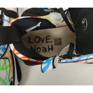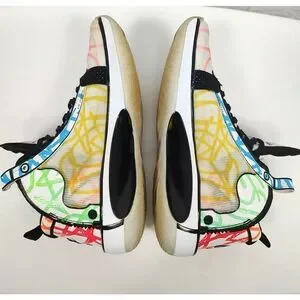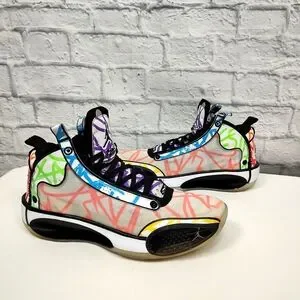 The Air Jordan XXXIV Zion Williamson Coloring Book with purple, green, blue, red, yellow and orange crayon scribbles. Underneath the sneaker's decorated upper is a simple white midsole that features a black flight plate. The right insole features "Love Noah" writing, while the left insole reads, "To Zion." The shoes feature a Nike Swoosh on the heels and a Jumpman logo on the outsole and the tongue.