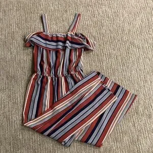 Stylish jumpsuit with vibrant stripes. Features ruffled neckline and sleeveless design. Perfect for casual outings.