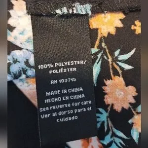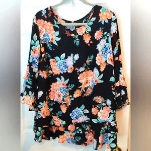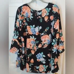 Elegant women's top featuring a vibrant floral design on a black background. Perfect for any occasion.