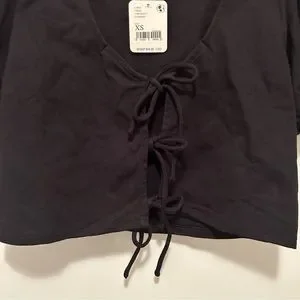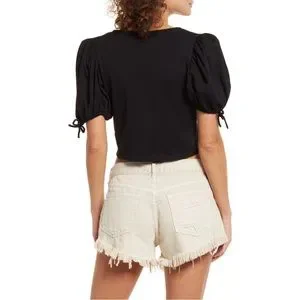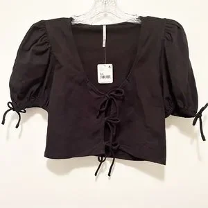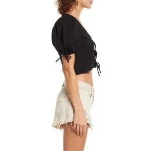 Stylish black crop top. Features puff sleeves and front tie details. Perfect for casual outings.