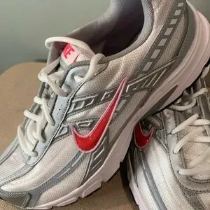 Sleek Nike sneakers with metallic silver finish and bold red accents. Ideal for everyday wear.